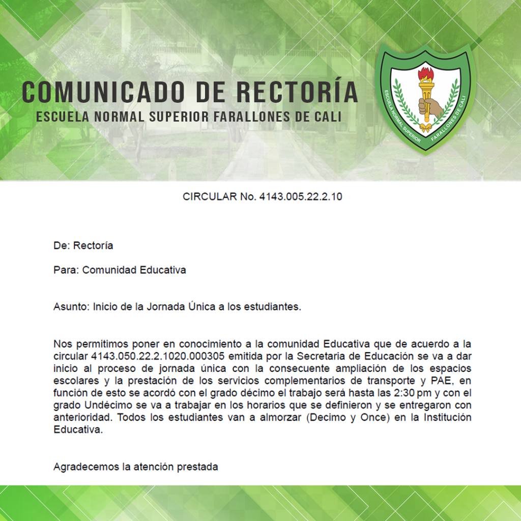 Nos permitimos poner en conocimiento a la comunidad Educativa que de acuerdo a la circular 4143.050.22.2.1020.000305 emitida por la Secretaria de Educación se va a dar inicio al proceso de jornada única con la consecuente ampliación de los espacios