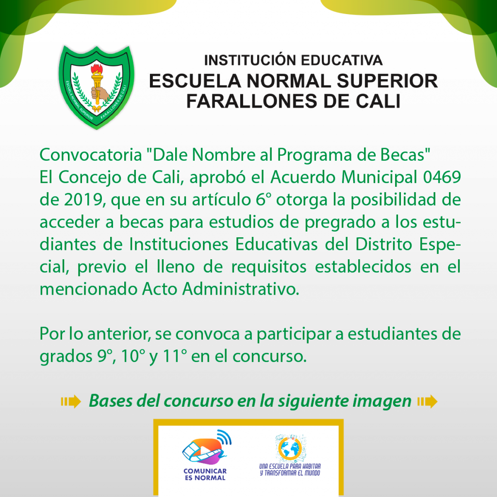 El Concejo de Cali, aprobó el Acuerdo Municipal 0469 de 2019, que en su artículo 6° otorga la posibilidad de acceder a becas para estudios de pregrado a los estudiantes de Instituciones EDUCATIVAS oFICIALES DEL Distrito Especial, previo el lleno de requisitos establecidos en el mencionado Acto Administrativo. Por lo anterior, se convoca a participar a estudiantes de grados 9°, 10° y 11° en el concurso.