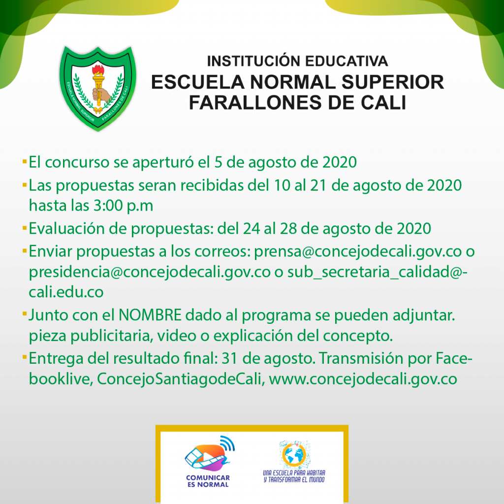 – Enviar propuestas a los correos: prensa@concejodecali.gov.co o presidencia@concejodecali.gov.co o sub_secretaria_calidad@cali.edu.co