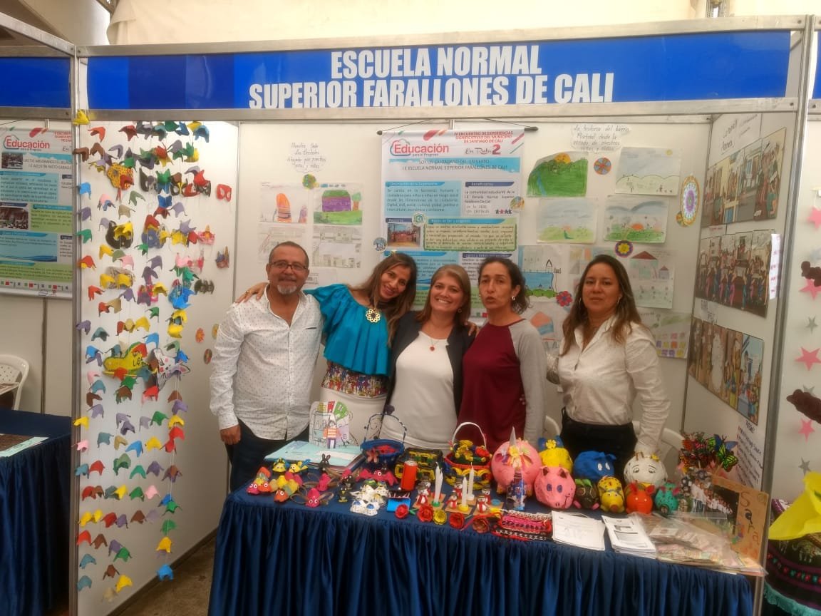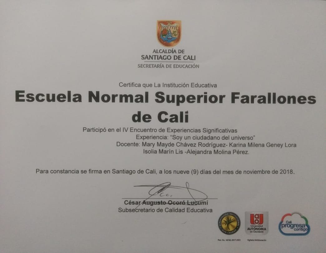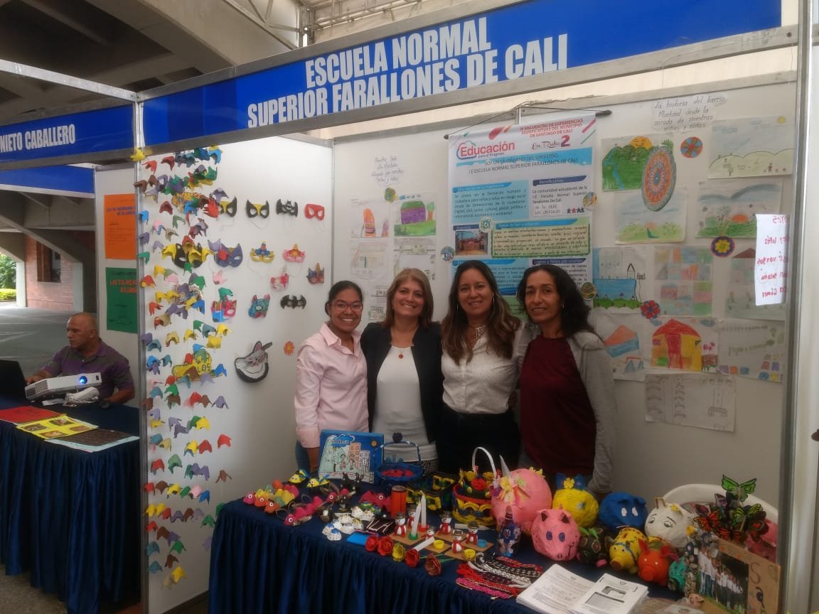 Stand del Proyecto » Soy un ciudadano del universo» en el IV Encuentro Experiencias Significativas del Municipio de Santiago de Cali, nov 9 de 2018. Sede Los Cristales: Prof. Karina M. Geney (Dimensión civil y social), Alejandra Molina (Dimensión Política e Intercultural), Mary M. Chavez (Dimensión Digital) e Isolia Marín (Dimensión Cultural y Cosmopolita)